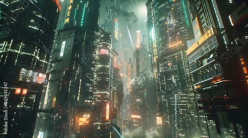 Fototapeta premium A futuristic cyberpunk cityscape at night with glowing neon lights and towering skyscrapers, showcasing a high-tech urban environment.