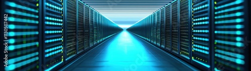 © watcharee, Obraz premium A futuristic data center corridor illuminated by blue lights, showcasing rows of servers and creating a tech-driven atmosphere.