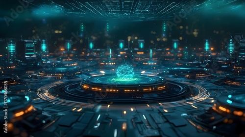 Fototapeta premium A futuristic data center with quantum computing servers emitting glowing blue and green lights surrounded by holographic data streams leaving copy space at the top for text overlay or composition