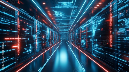 Fototapeta premium A futuristic data center with red and blue neon lights shining on the walls, displaying binary code and digital data.