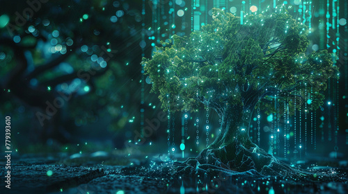 Naklejka premium A futuristic depiction of a tree morphing into a digital currency display,