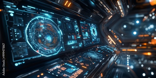 Fototapeta premium A futuristic design featuring space-themed tech elements, with glowing holograms, interactive star maps, and sleek data panels.