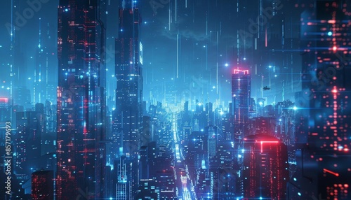 Obraz premium A futuristic digital cityscape with blue and red lights