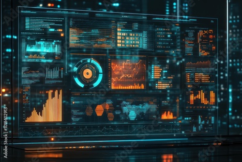 © Umi Sakina, Obraz premium A futuristic digital display with glowing data visualizations and graphs.