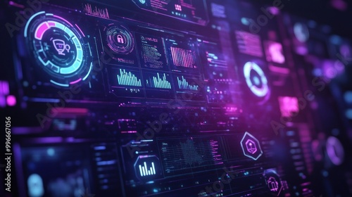 © BerkahStock, Obraz premium A futuristic digital interface displaying data and analytics in vibrant colors.