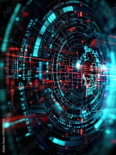 Fototapeta premium A futuristic digital interface displaying data patterns and a globe,...