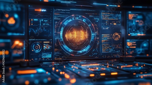 Obraz premium A futuristic digital interface with data visualizations on a large screen,...