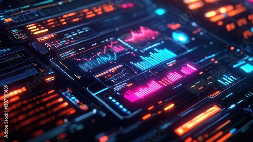 Obraz premium A futuristic digital interface with glowing graphs and data visualizations.