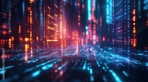 © putri syakilla, Obraz premium A futuristic digital landscape with glowing lines and nodes, representing data flow and technology.