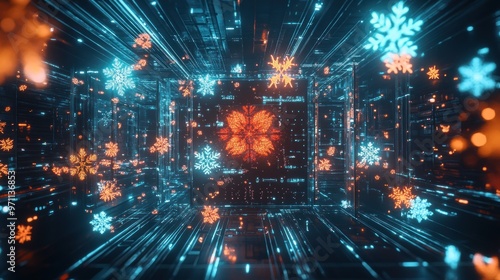 © AURA COLLECTIONS, Obraz premium A futuristic digital landscape with glowing snowflakes and vibrant lights.