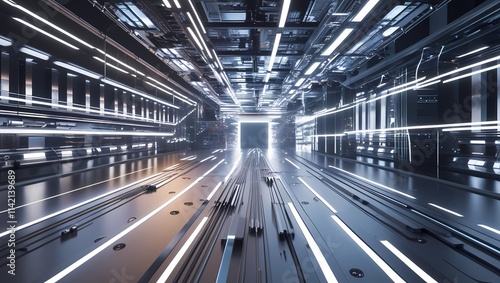 © Pongsatorn, Naklejka premium A futuristic digital world filled with reflective nerve impulses, electrical currents, and holographic patterns representing advanced network technology.