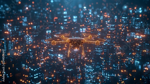 Obraz premium A futuristic drone hovers over a dazzling cityscape at night, illuminating...