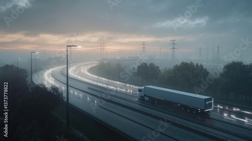 © Sampao, Fototapeta premium A futuristic electric freight truck on a smart highway at dawn.