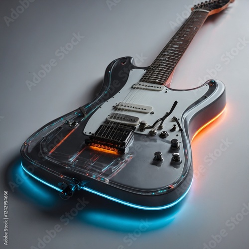 © Ghulam, Obraz premium A futuristic electric guitar with neon strings glowing vividly against a white surface.