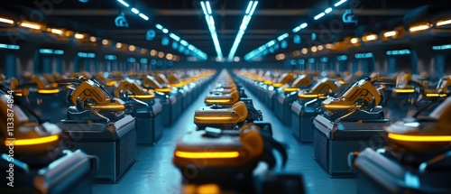 Obraz premium A futuristic factory floor illuminated by rows of robotic machines working...