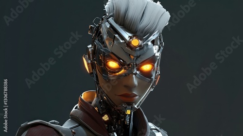 Naklejka premium A futuristic female cyborg with glowing eyes and metallic headwear