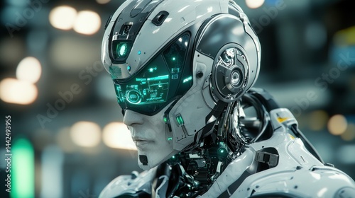 Fototapeta premium A futuristic figure wearing a technologically advanced protective helmet