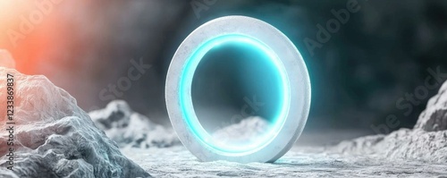 Fototapeta premium A futuristic glowing ring sits on a rocky surface, surrounded by a mystical atmosphere, hinting at otherworldly realms.