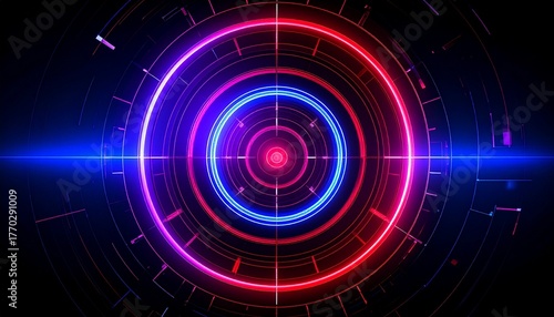 © photostockatinat, Obraz premium A futuristic glowing target with red and blue circles and a bright center