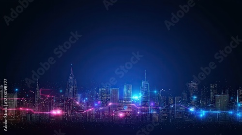 © Attasit, Obraz premium A futuristic glowing wireframe city skyline with AI-driven data flows, neon blue lights illuminating the skyline