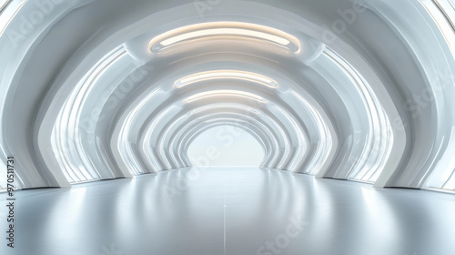 Obraz premium A futuristic hall with a round, geometric arch ceiling. The scene is a 3D...