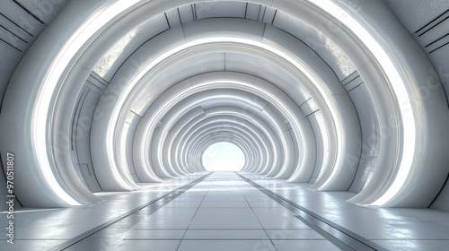 Obraz premium A futuristic hall with a round, geometric arch ceiling. The scene is a 3D...