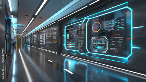 Obraz premium A futuristic hallway with holographic displays and digital interfaces, showcasing advanced technology and modern design