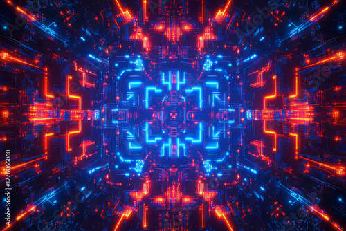 Naklejka premium A futuristic, high-tech circuit board pattern glowing with electric blue and red pathways, creating an intricate, sci-fi digital background with deep, immersive depth.