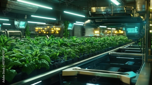 © Fana Art, Naklejka premium A futuristic, high-tech indoor farm with rows of plants growing under artificial lights.