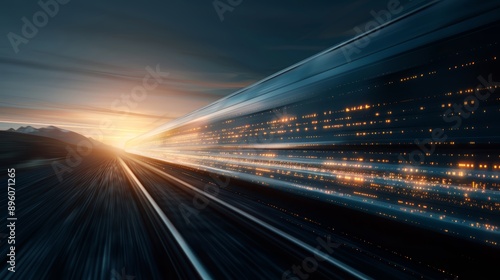 © tinnakorn, Obraz premium A futuristic highway with glowing lights streaks across a dark sky, illuminated by a distant sunset.