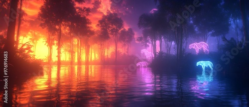 Obraz premium A futuristic holographic image of a nature reserve, with glowing outlines of wildlife moving through a digital forest, neon colors, high-tech, and surreal atmosphere.