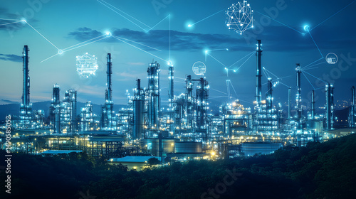 © Nathan, Fototapeta premium A futuristic industrial complex illuminated at night, showcasing advanced technology and connectivity in energy production.