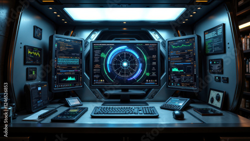 Fototapeta premium A futuristic industrial control room with a variety of screens displaying data and graphs.