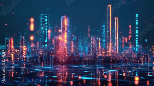 Fototapeta premium A futuristic industrial landscape with digital twin technology visualizing factory operations under neon lights.