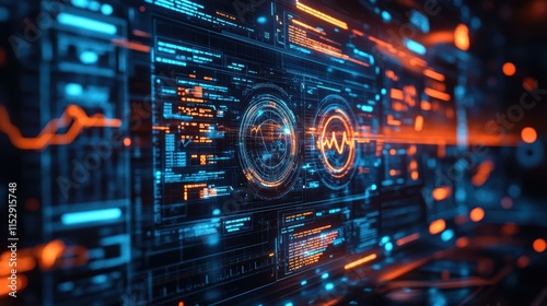 © jobim, Obraz premium A futuristic interface displaying medical data and patient vitals overlaid on a blue digital background.