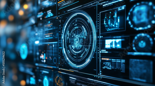 Obraz premium A futuristic interface with a central glowing circular display surrounded by smaller data panels.