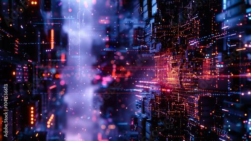 Fototapeta premium A futuristic 4K abstract background with glowing orange, pink, and blue circuitry patterns, featuring a grainy texture and blurred elements for a modern tech design
