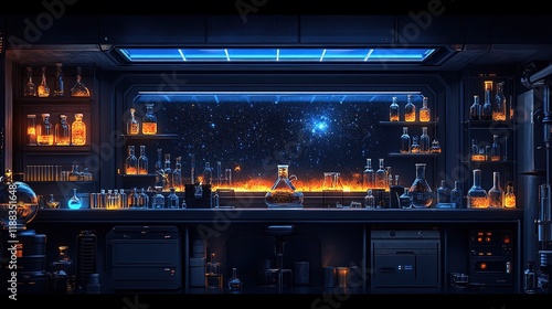 Fototapeta premium A futuristic laboratory filled with glowing bottles and scientific equipment, set against a starry backdrop.