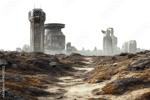 © Jeannaa, Obraz premium A futuristic landscape showcasing abandoned structures and a dusty path, evoking a sense of mystery and exploration. transparent background