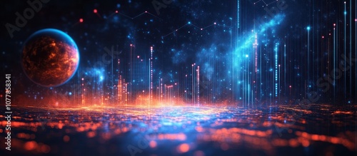 Naklejka premium A futuristic landscape with a glowing planet and digital lights.