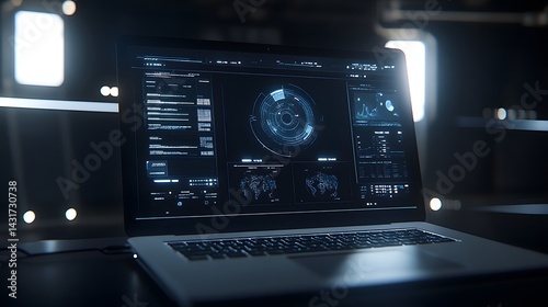 © Aditya, Fototapeta premium A futuristic laptop displays complex data visualizations, including world maps, charts, and graphs.