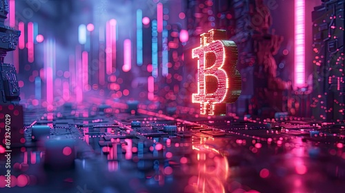 Fototapeta premium A futuristic low-poly 3D scene with a golden bitcoin symbol hovering over a digital grid, surrounded by abstract shapes and neon lights, highlighting the digital nature of cryptocurrency