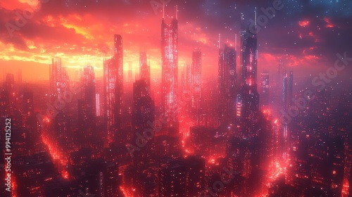 Fototapeta premium A Futuristic Metropolis bathed in a Crimson Glow with an ethereal sky filled...