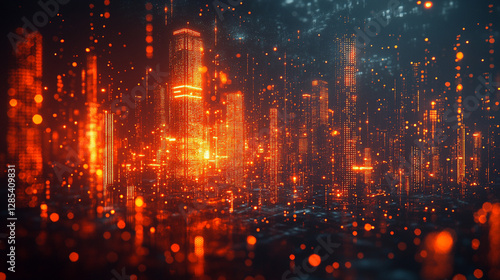 © Yoonnam, Naklejka premium A futuristic neon hologram interface displays a conceptual blueprint for modern residential construction, symbolizing innovation, smart technology, and the future of urban architecture