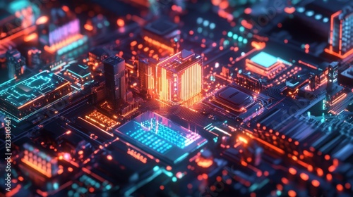 © Sawat, Obraz premium A futuristic neon-lit smart factory with AI-driven processes on a cyber black background.