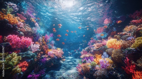 Naklejka premium A futuristic ocean with glowing coral reefs and neon-infused waves under a holographic sunset. Schools of digital fish swim through the bright coral, creating a lively and immersive seascape.