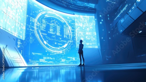 © kwanchaift, Naklejka premium A futuristic office scene showcasing a user interacting with a floating holographic interface displaying data visualizations, bathed in soft blue light.