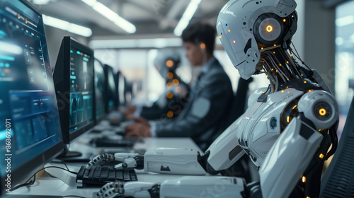 Fototapeta premium A futuristic office setting where a robot is working at a computer among...