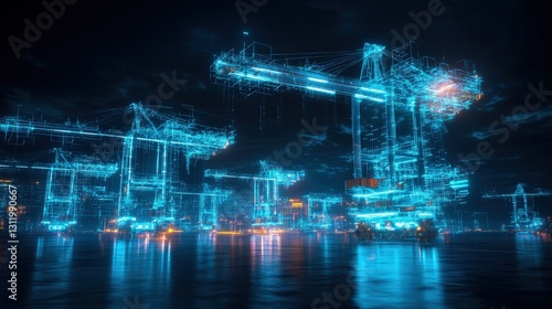 Fototapeta premium A futuristic port with glowing digital cranes and self-loading cargo.