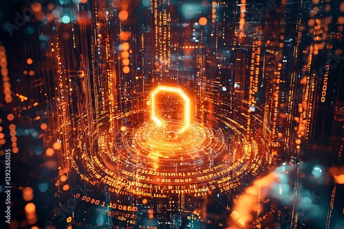 Fototapeta premium A futuristic rendering a glowing lock surrounded by cascading binary patterns and encrypted layers protection.